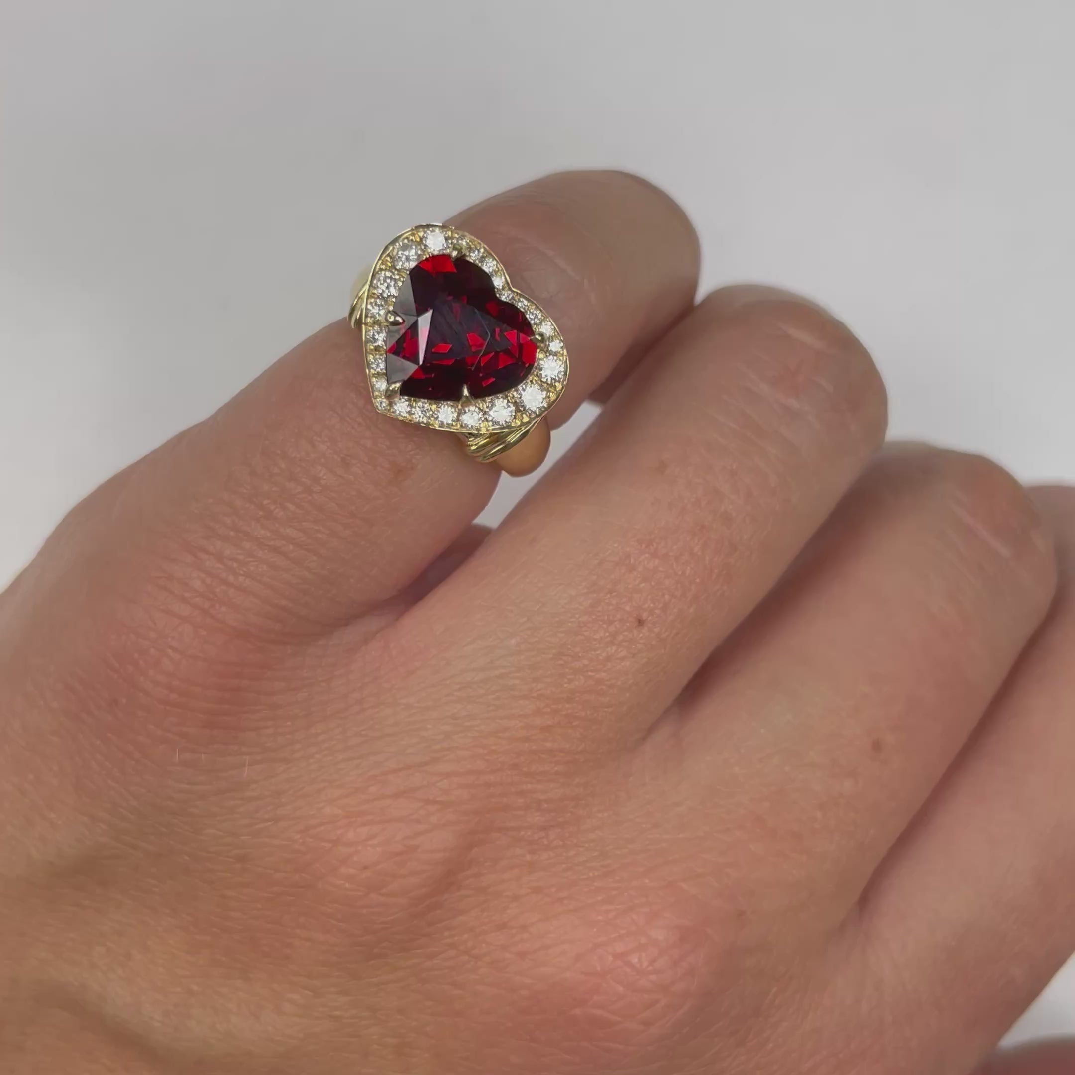 The Tesoro Ring brings a contemporary edge to the classic heart motif. A tapered diamond halo frames a deep-red garnet, enhancing the heart shape while adding depth. Crafted in 14k gold, the design features exposed eagle-claw prongs that secure the hand-selected center stone and create a subtle, offbeat detail. The ring is stunning on its own, yet versatile enough to pair with other rings.